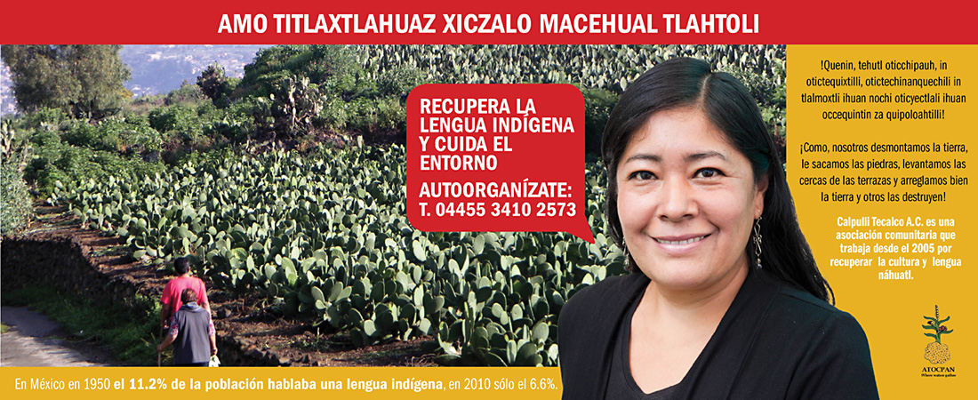 One ad made with each organization: MIRAVALLE, CEREAL, CANANEA, CALPULLI TECALCO The Calpulli Tecalco ad, about the preservation of indigenous language and culture, was used also for the exhibition invitation card.